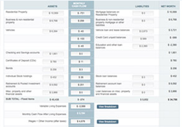 1. The top portion includes your balance sheet, comprised of assets (what you own) and liabilities (what you owe).  It also shows monthly cash flows – positive and negative – associated with each of your balance sheet items.  Assets, liabilities, and cash flow amounts in this section are FIXED amounts.